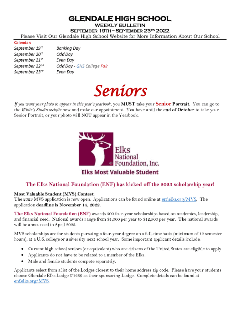 GLENDALE HIGH SCHOOL WEEKLY BULLETIN September 19th September 23rd 2022 Please Visit Our Glendale High School Website for More Information About Our School Calendar:September 19th September 20th September