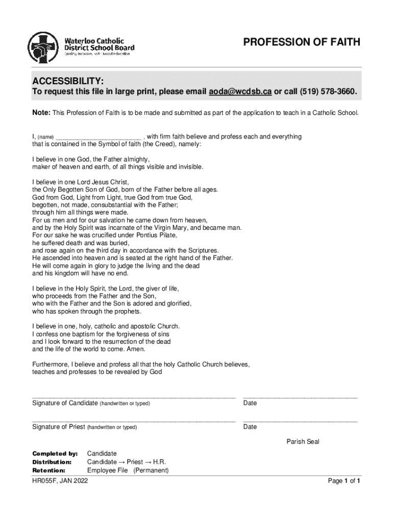 PROFESSION OF FAITHACCESSIBILITY: To request this file in large print, please email aoda@wcdsb.ca or call (519) 5783660. Note: This Profession of Faith is to be made and submitted as part of the application