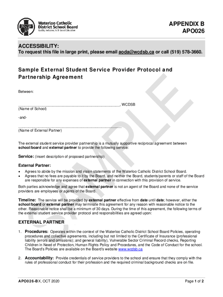 APPENDIX B APO026 ACCESSIBILITY: To request this file in large print, please email aoda@wcdsb.ca or call (519) 5783660. Sample External Student Service Provider Protocol and Partnership Agreement