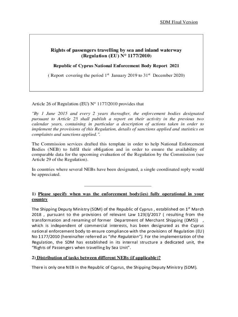 SDM Final VersionRights of passengers travelling by sea and inland waterway (Regulation (EU) N 1177/2010) Republic of Cyprus National Enforcement Body Report 2021 (Report covering the period 1st January