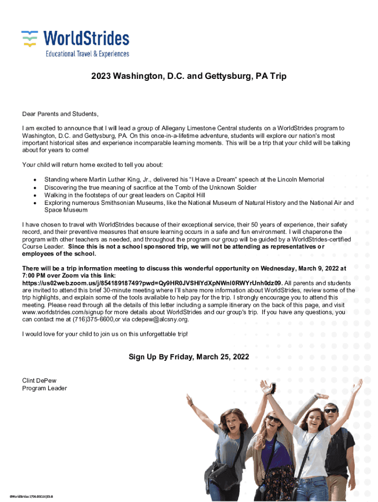 2023 Washington, D.C. and Gettysburg, PA Trippers Parents and Students, I am excited to announce that I will lead a group of Alleging Limestone Central students on a WorldStrides program to Washington,