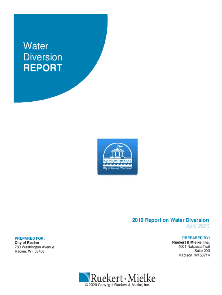Water Diversion REPORT2019 Report on Water Diversion April 2020 PREPARED BY: Rupert & Mile, Inc. 4001 NASA Trail Suite 200 Madison, WI 53714PREPARED FOR: City of Racine 730 Washington Avenue Racine,