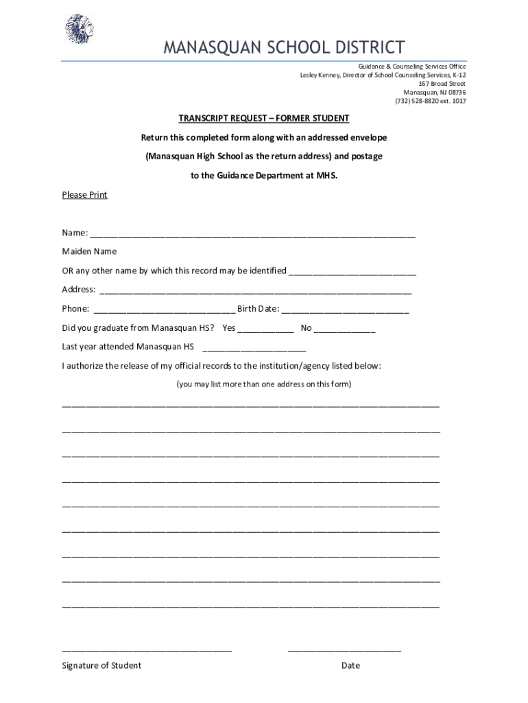 MANAGUA SCHOOL DISTRICT Guidance & Counseling Services Office Lesley Kenney, Director of School Counseling Services, K12 167 Broad Street Managua, NJ 08736 (732) 5288820 ext. 1017TRANSCRIPT REQUEST