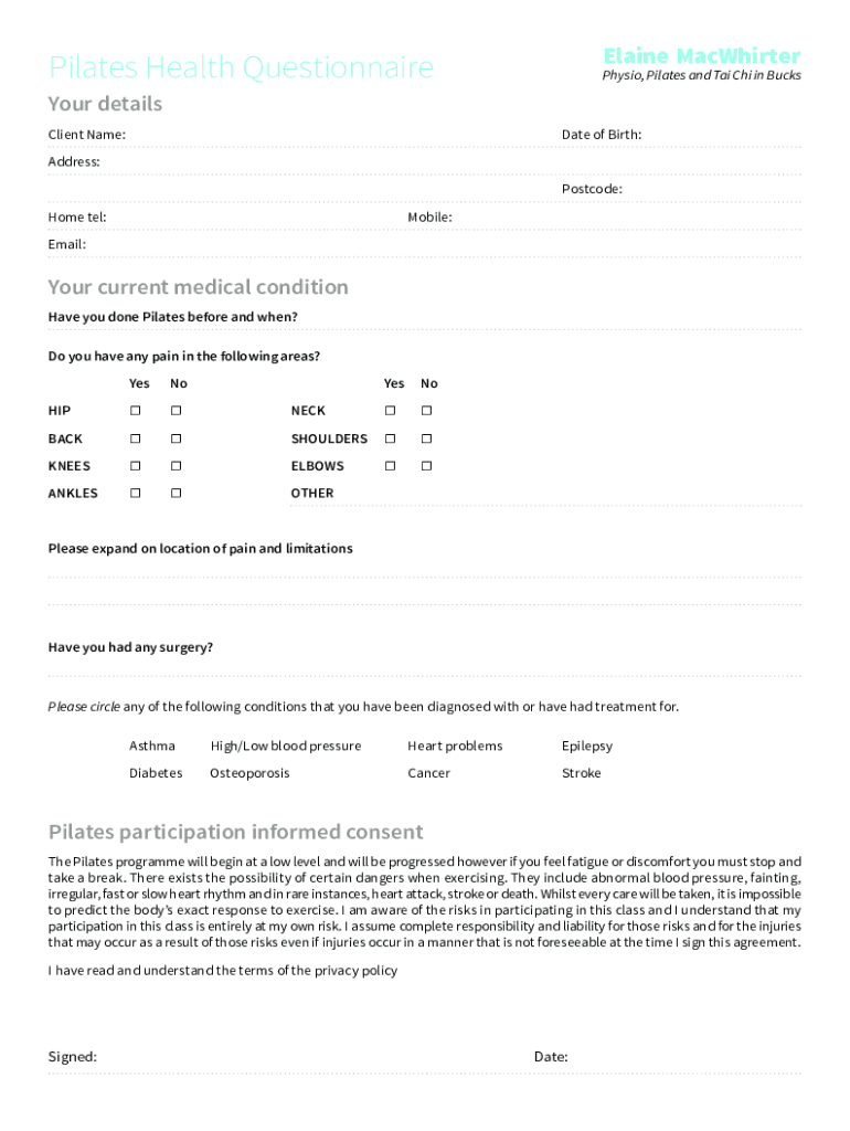To fill out a health questionnaire ampamp pilates form, individuals need to provide accurate information about their medical history, current health status, and any existing conditions that may impact their ability to safely engage in pilates exercises.