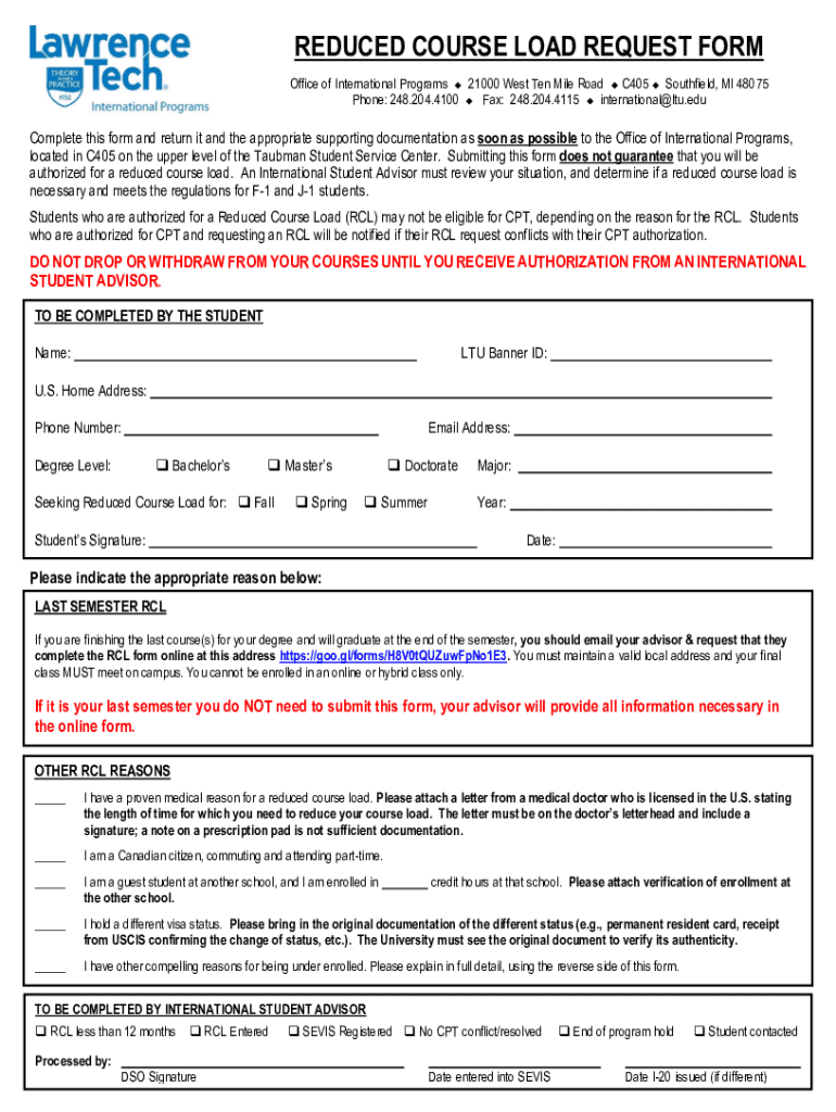 REDUCED COURSE LOAD REQUEST FORM Office of International Programs 21000 West Ten Mile Road C405 Southfield, MI 48075 Phone: 248.204.4100 Fax: 248.204.4115 international@ltu.eduComplete this form and