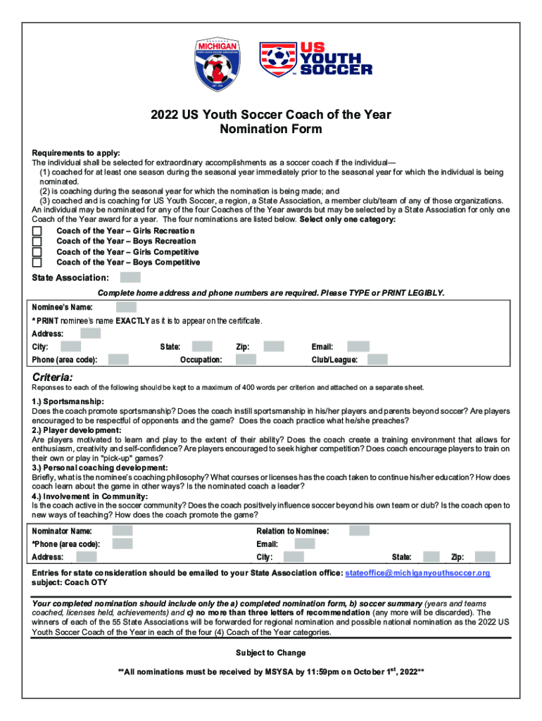 2022 US Youth Soccer Coach of the Year Nomination Form Requirements to apply: The individual shall be selected for extraordinary accomplishments as a soccer coach if the individual (1) coached for