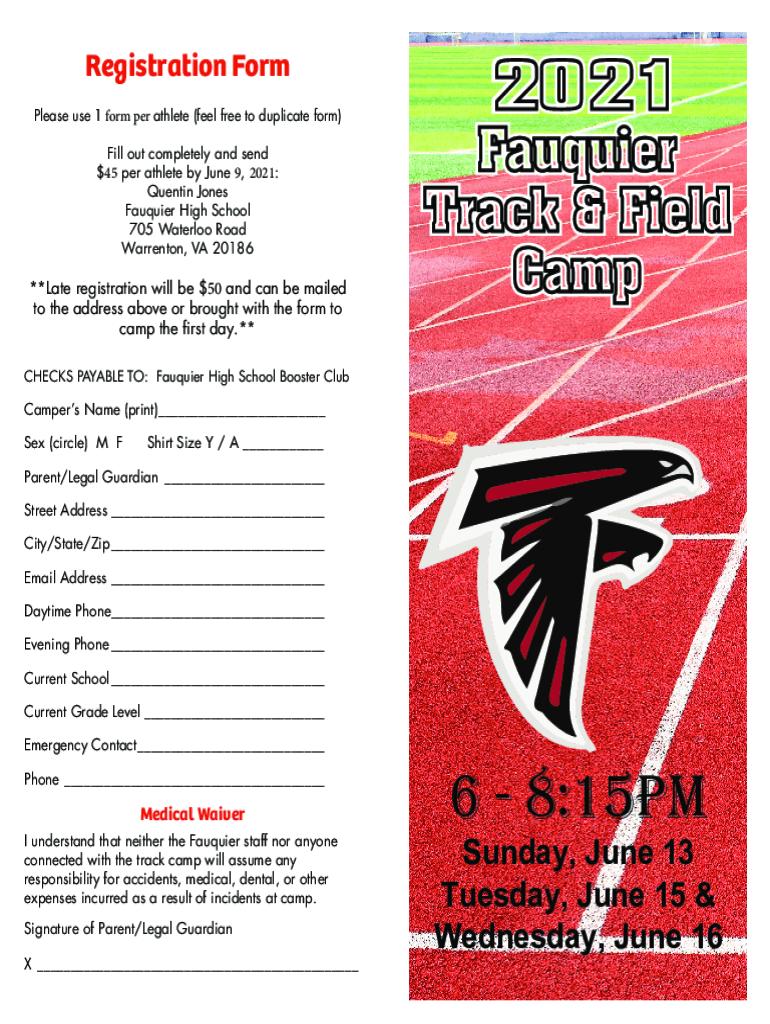 Registration Form Please use 1 form per athlete (feel free to duplicate form) Fill out completely and send $45 per athlete by June 9, 2021: Quentin Jones Faultier High School 705 Waterloo Road Warren