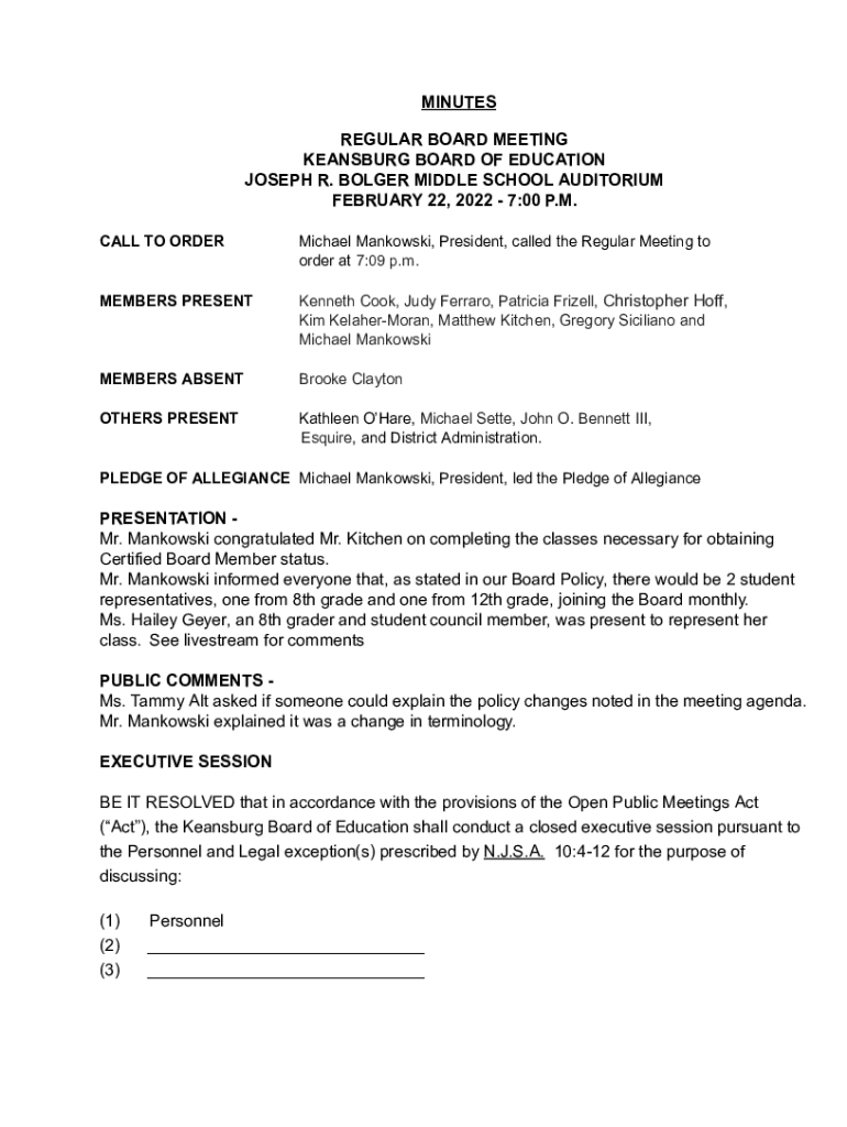 MINUTES REGULAR BOARD MEETING GINSBURG BOARD OF EDUCATION JOSEPH R. BOLDER MIDDLE SCHOOL AUDITORIUM FEBRUARY 22, 2022 7:00 P.M. CALL TO ORDER Michael Minkowski, President, called the Regular Meeting