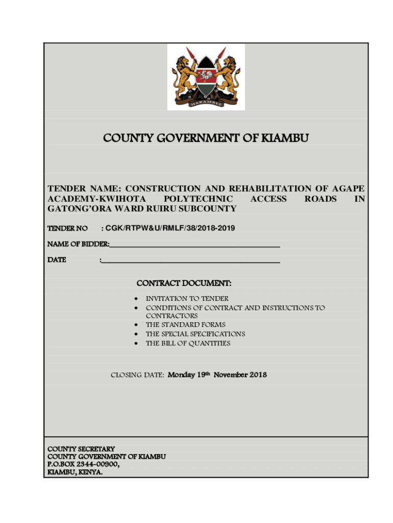 COUNTY GOVERNMENT OF KIAMBUTENDER NAME: CONSTRUCTION AND REHABILITATION OF AGAPE ACADEMYKWIHOTA POLYTECHNIC ACCESS ROADS IN ANGORA WARD RU IRU COUNTY TENDER NO: CGK/RTU/MLF/38/20182019NAME OF BIDDER:___