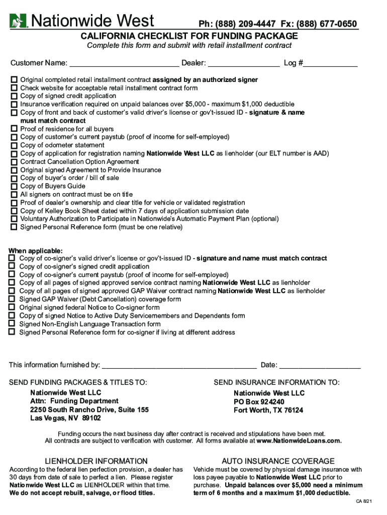 Nationwide West: (888) 2094447 FX: (888) 6770650 CALIFORNIA CHECKLIST FOR FUNDING PACKAGE Complete this form and submit with retail installment contractCustomer Name: ___ Dealer: ___ Log #___ Original