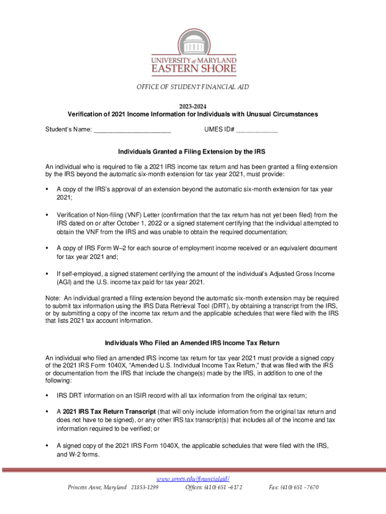 OFFICE OF STUDENT FINANCIAL AID 20232024 Verification of 2021 Income Information for Individuals with Unusual Circumstances Students Name: ___USES ID# ___Individuals Granted a Filing Extension by