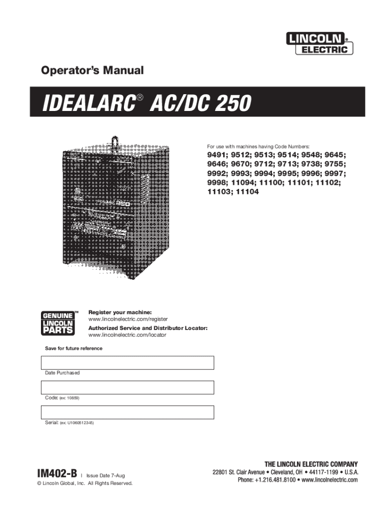 Get the free Lincoln Electric IDEALARC AC/DC 250 Operator's Manual