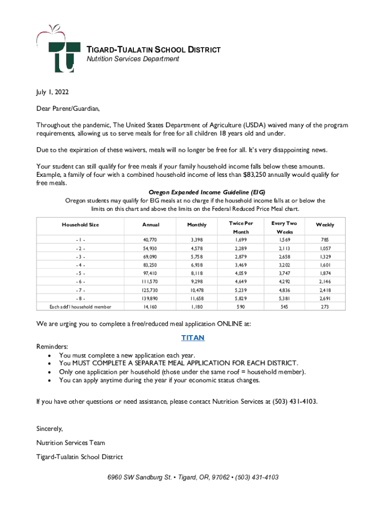 TIGARDTUALATIN SCHOOL DISTRICT Nutrition Services Department July 1, 2022, Dear Parent/Guardian, Throughout the pandemic, The United States Department of Agriculture (USDA) waived many of the program