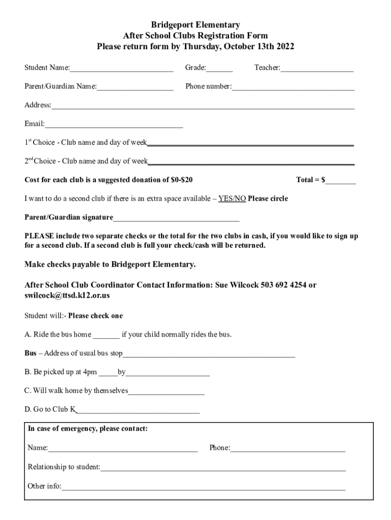 Bridgeport Elementary After School Clubs Registration Form Please return form by Thursday, October 13th 2022 Student Name:___Grade:___Teacher:___Parent/Guardian Name:___Phone number:___Address:___