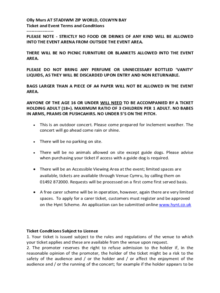 Only Mrs AT STADIUM ZIP WORLD, COLUMN BAY Ticket and Event Terms and Conditions PLEASE NOTE STRICTLY NO FOOD OR DRINKS OF ANY KIND WILL BE ALLOWED INTO THE EVENT ARENA FROM OUTSIDE THE EVENT AREA.