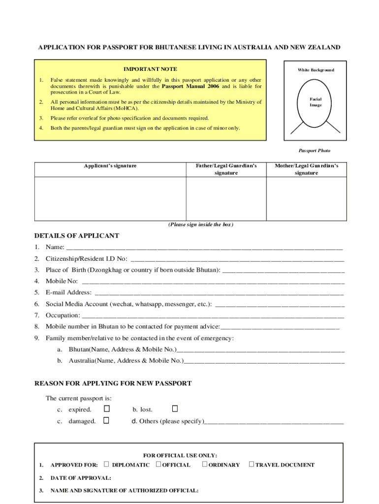 APPLICATION FOR PASSPORT FOR BHUTANESE LIVING IN AUSTRALIA AND NEW ZEALANDIMPORTANT NOTE White Background1. False statement made knowingly and willfully in this passport application or any other documents
