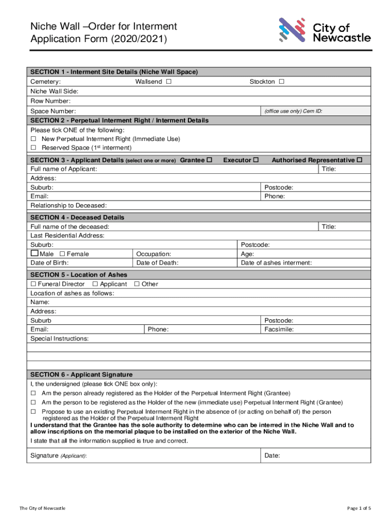 Get the free Niche Wall - Order for Interment Application - City of Newcastle - newcastle nsw gov
