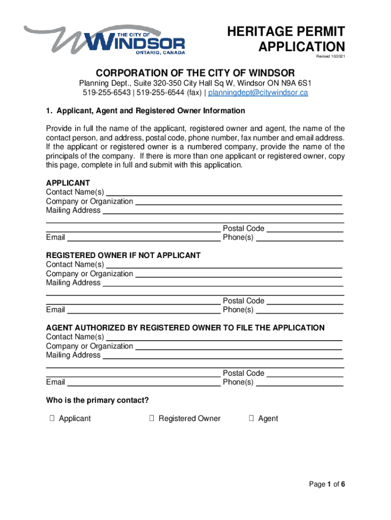HERITAGE PERMIT APPLICATION Revised 10/2021CORPORATION OF THE CITY OF WINDSOR Planning Dept., Suite 320350 City Hall Sq W, Windsor ON N9A 6S1 5192556543 | 5192556544 (fax) | planningdept@citywindsor.ca