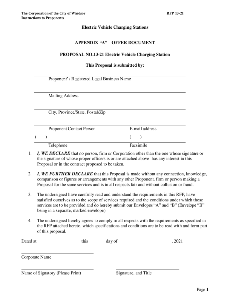 The Corporation of the City of Windsor Instructions to Proponents RFP 1321Electric Vehicle Charging Stations APPENDIX A OFFER DOCUMENT PROPOSAL NO.1321 Electric Vehicle Charging Station This Proposal