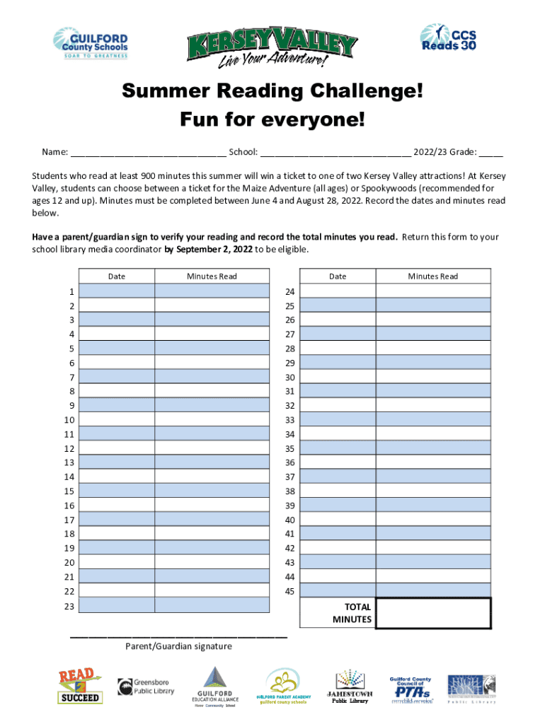 Summer Reading Challenge! Fun for everyone! Name: ___ School: ___ 2022/23 Grade: ___ Students who read at least 900 minutes this summer will win a ticket to one of two Jersey Valley attractions! At
