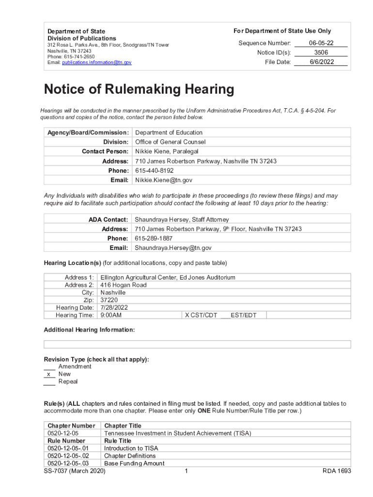 For Department of State Use OnlyDepartment of State Division of Publications 312 Rosa L. Parks Ave., 8th Floor, Snodgrass/TN Tower Nashville, TN 37243 Phone: 6157412650 Email: publications.information@tn.govSequence