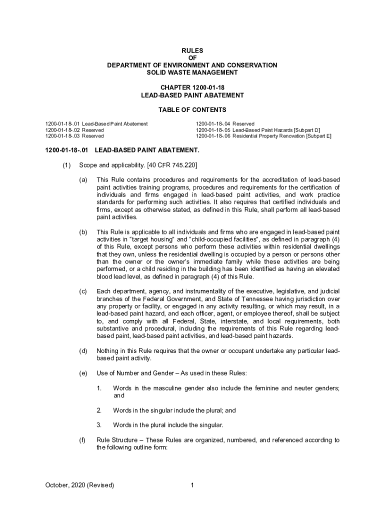 RULES OF DEPARTMENT OF ENVIRONMENT AND CONSERVATION SOLID WASTE MANAGEMENT CHAPTER 12000118 LEASED PAINT ABATEMENT TABLE OF CONTENTS 12000118.01 Leased Paint Abatement 12000118.02 Reserved 12000118.03