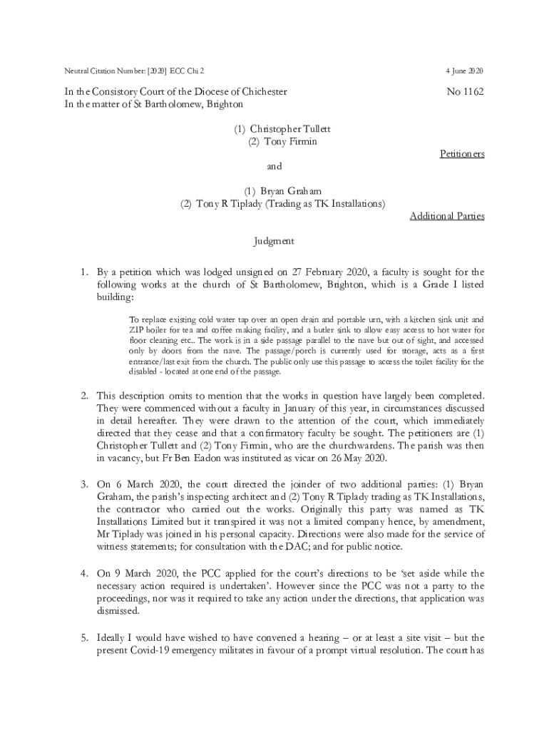 Neutral Citation Number: [2020] ECC Chi 24 June 2020In the Consistory Court of the Diocese of Colchester In the matter of St Bartholomew, Brighton No 1162(1) Christopher Mullett (2) Tony Firming and