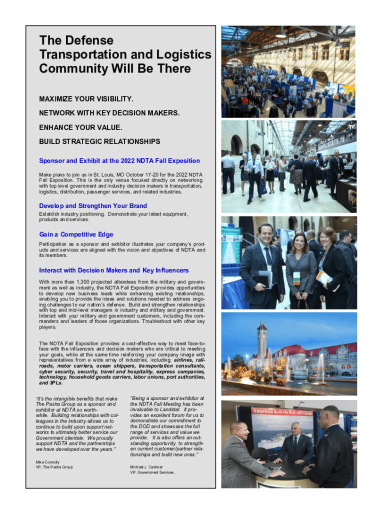 The Defense Transportation and Logistics Community Will Be There MAXIMIZE YOUR VISIBILITY.NETWORK WITH KEY DECISION MAKERS. ENHANCE YOUR VALUE. BUILD STRATEGIC RELATIONSHIPS Sponsor and Exhibit at