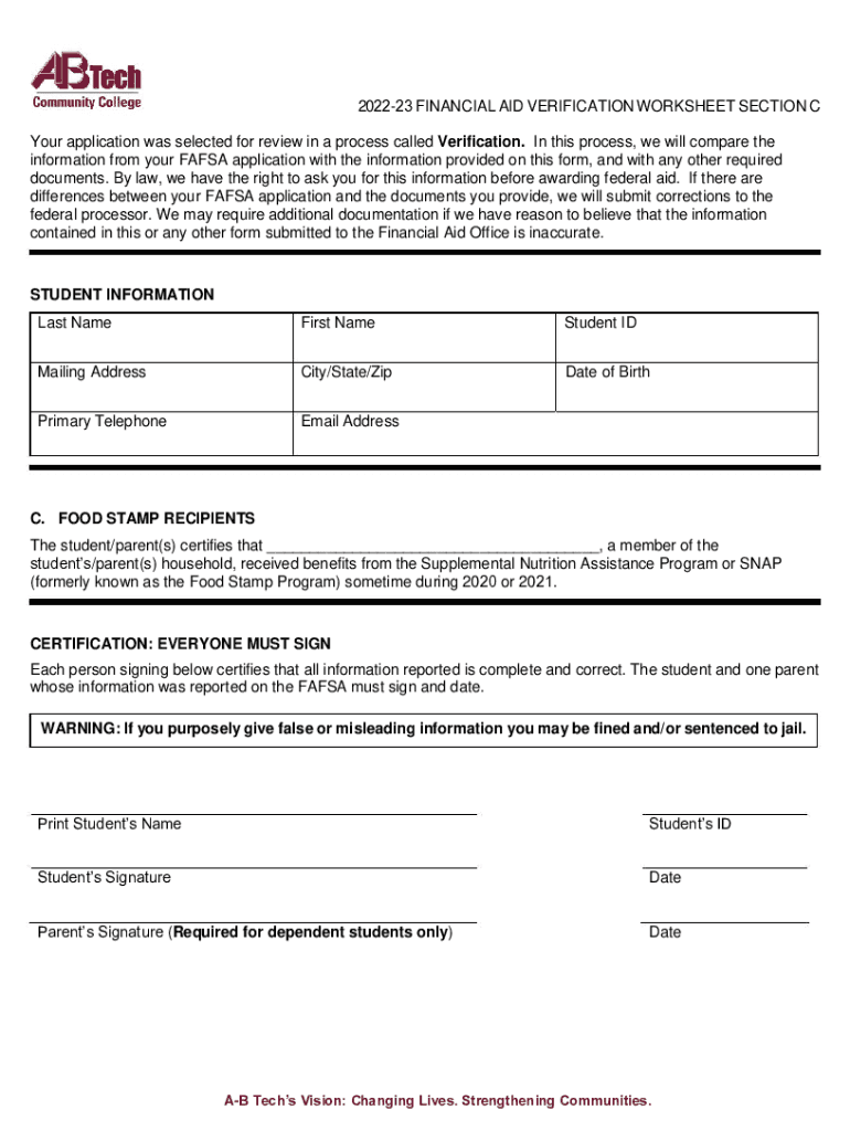 AB, each Community College202223 FINANCIAL AID VERIFICATION WORKSHEET SECTION Your application was selected for review in a process called Verification. In this process, we will compare the information