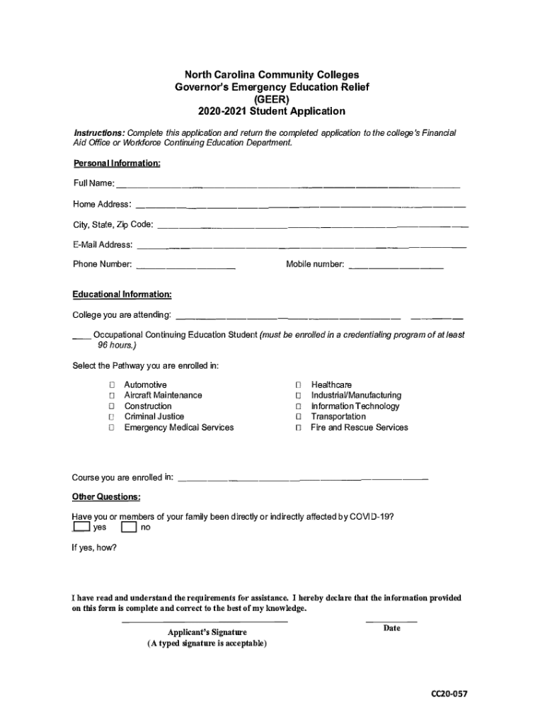 North Carolina Community Colleges Governor\'s Emergency Education Relief (BEER) 20202021 Student Application Instructions: Complete this application and return the completed application to the college\'s
