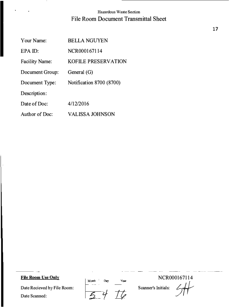 Hazardous Waste Sectionize Room Document Transmittal Sheet 17 Your Name:BELLA NGUYEN ID:NCR000167114Facility Name:FILE PRESERVATIONDocument Group:General (G)Document Type:Notification 8700 (8700)Description:
