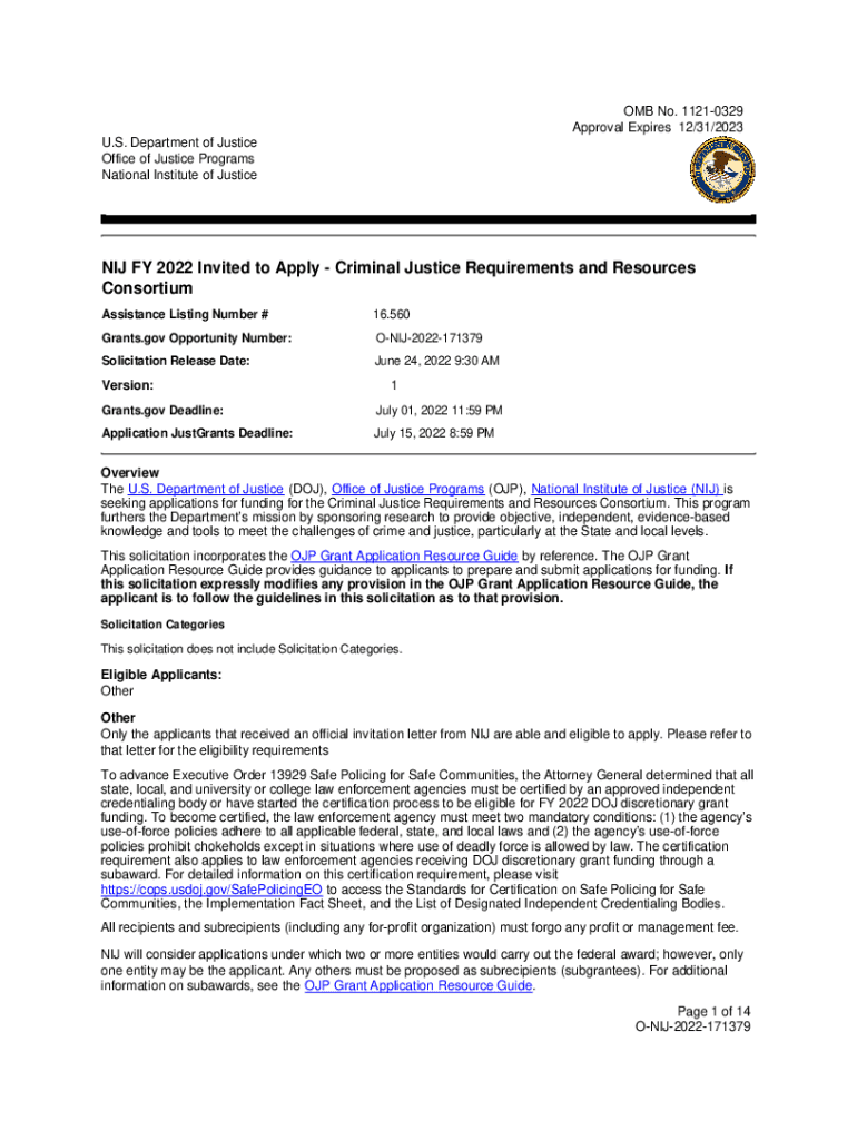 OMB No.11210329 Approval Expires 12/31/2023 U.S. Department of Justice Office of Justice Programs National Institute of Justice FY 2022 Invited to Apply Criminal Justice Requirements and Resources