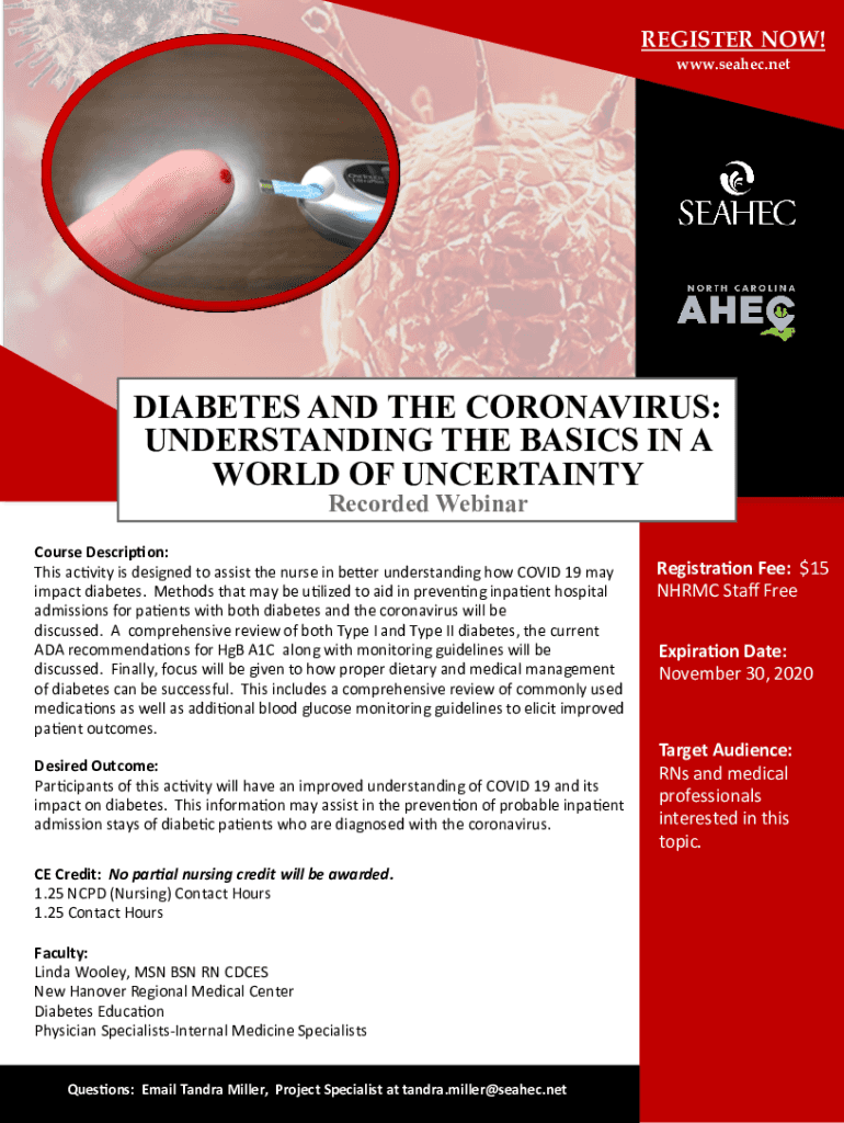 REGISTER NOW! www.seahec.netDIABETES AND THE CORONAVIRUS: UNDERSTANDING THE BASICS IN A WORLD OF UNCERTAINTY Recorded WebinarCourse Description: This activity is designed to assist the nurse in better