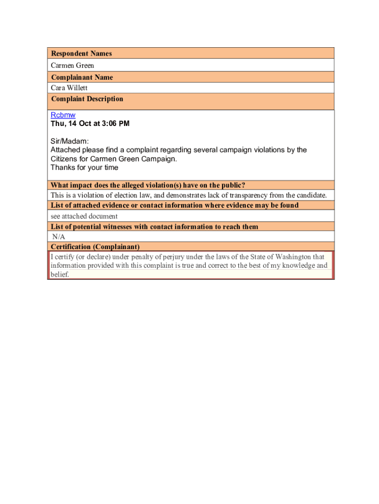 Get the free Green, Carmen: Alleged violation of RCW 42.17A.555 by ...