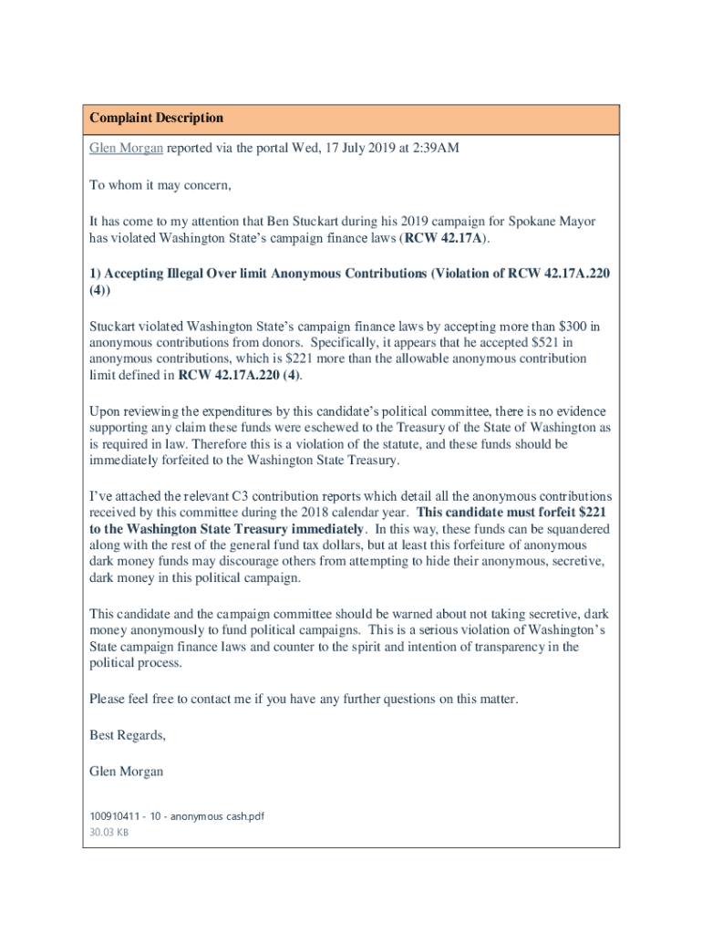 Complaint Description Glen Morgan reported via the portal Wed, 17 July 2019 at 2:39AM To whom it may concern, It has come to my attention that Ben Stuck art during his 2019 campaign for Spokane Mayor