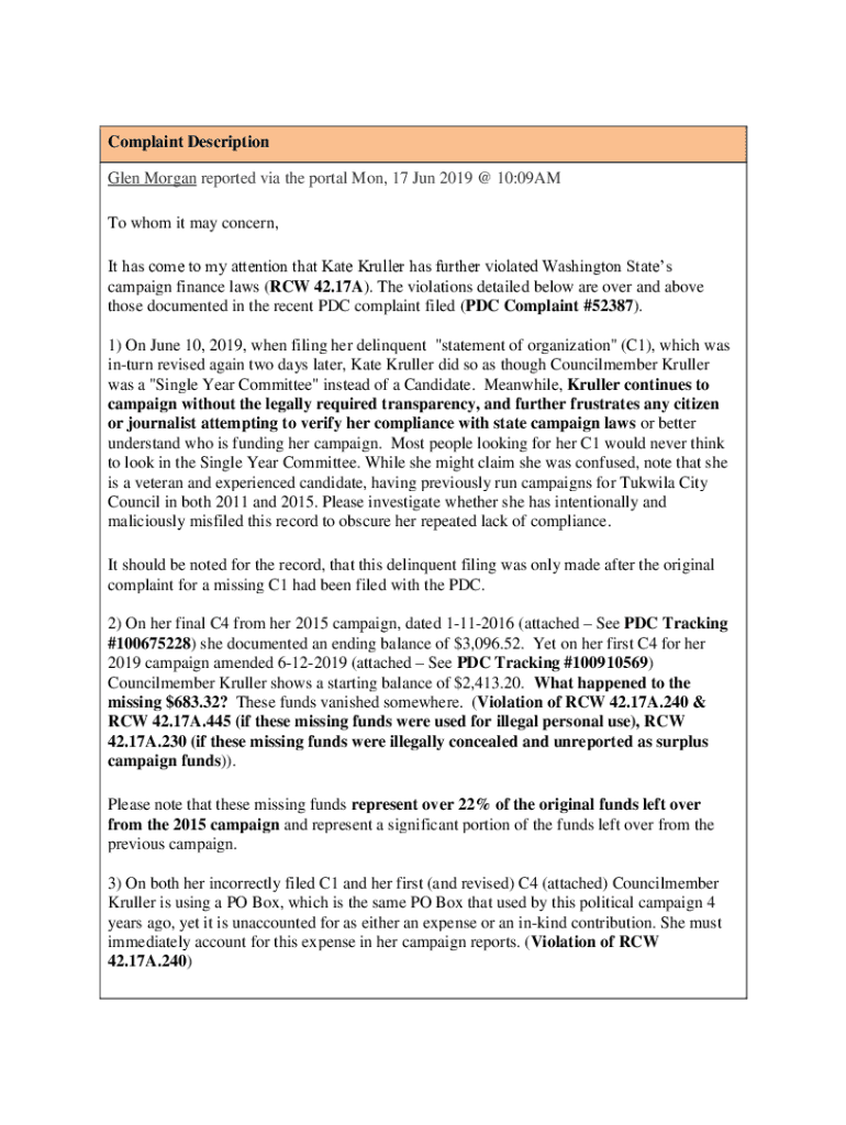 Complaint Description Glen Morgan reported via the portal Mon, 17 Jun 2019 @ 10:09AM To whom it may concern, It has come to my attention that Kate Cruller has further violated Washington States campaign