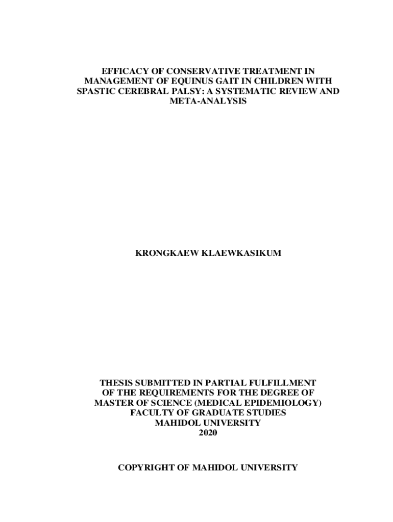 EFFICACY OF CONSERVATIVE TREATMENT IN MANAGEMENT OF EQUINES GAIT IN CHILDREN WITH SPASTIC CEREBRAL PALSY: A SYSTEMATIC REVIEW AND METAANALYSISKRONGKAEW KLAEWKASIKUMTHESIS SUBMITTED IN PARTIAL FULFILLMENT