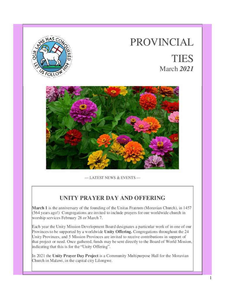 PROVINCIAL TIES March 2021 LATEST NEWS & EVENTS UNITY PRAYER DAY AND OFFERING March 1 is the anniversary of the founding of the Unitas Frat rum (Moravian Church), in 1457 (564 years ago!) Congregations