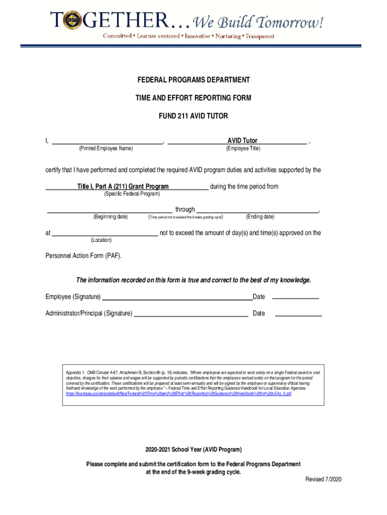 FEDERAL PROGRAMS DEPARTMENT TIME AND EFFORT REPORTING FORM FUND 211 AVID TUTOR I, (Printed Employee Name)AVID Tutor(Employee Title), certify that I have performed and completed the required AVID program