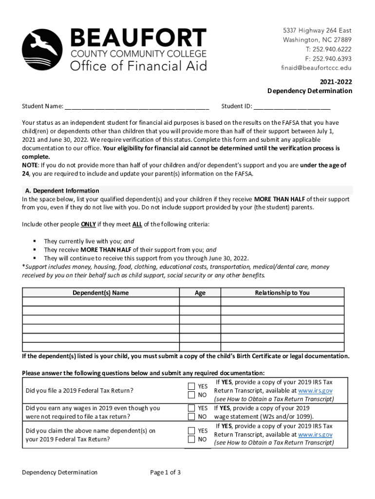 20212022 Dependency Determination Student Names: ___Student ID: ___Your status as an independent student for financial aid purposes is based on the results on the FAFSA that you have child(men) or