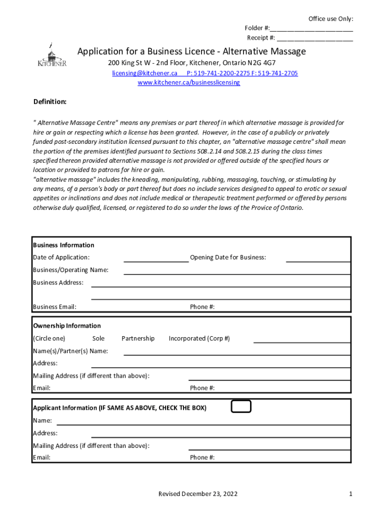 Office use Only: Folder #:___ Receipt #: ___Application for a Business License Alternative Massage 200 King St W 2nd Floor, Kitchener, Ontario N2G 4G7licensing@kitchener.ca P: 51974122002275 F: 5197412705