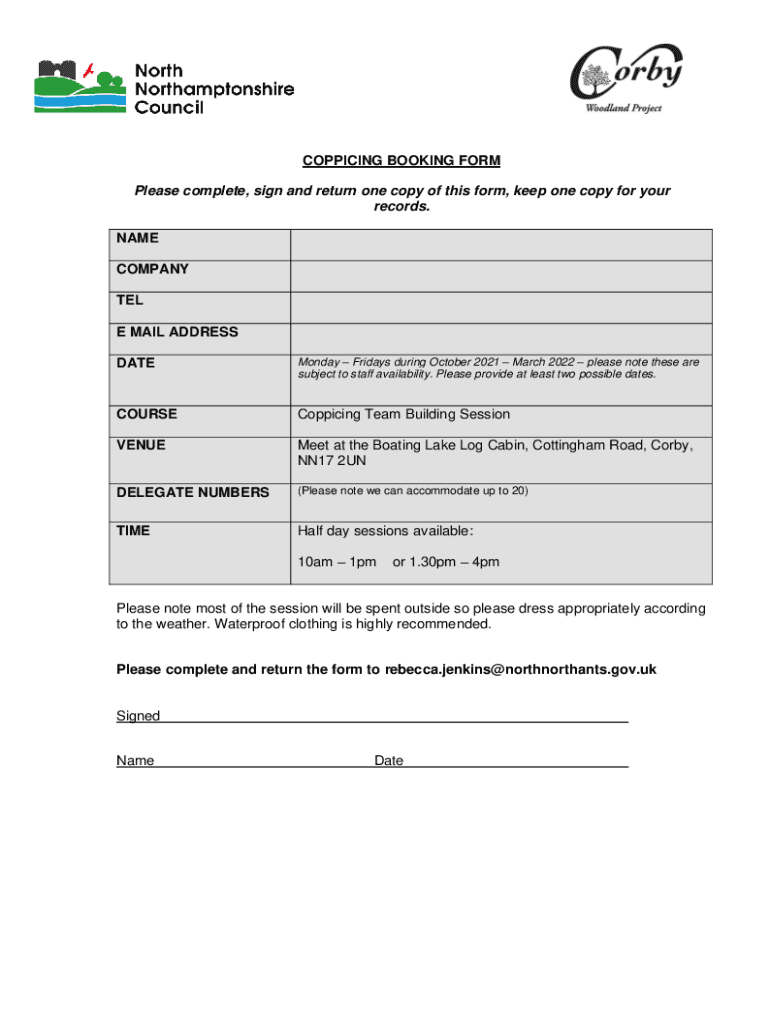 COPPICING BOOKING FORM Please complete, sign and return one copy of this form, keep one copy for your records. NAME COMPANY TEL E MAIL ADDRESS DATE Monday Fridays during October 2021 March 2022 please