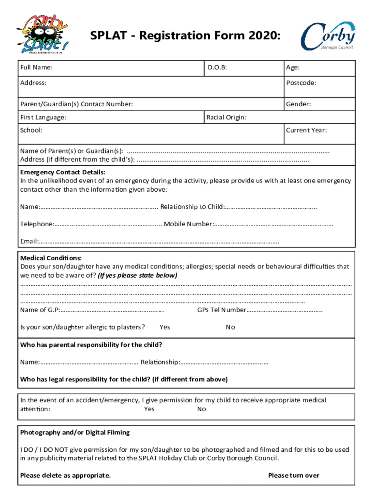 SPLAT Registration Form 2020: Full Name:D.O.B:Age:Address:Postcode:Parent/Guardian(s) Contact Number:Gender:First Language:Racial Origin:School:Current Year:Name of Parent(s) or Guardian(s): ...........................................................................................................