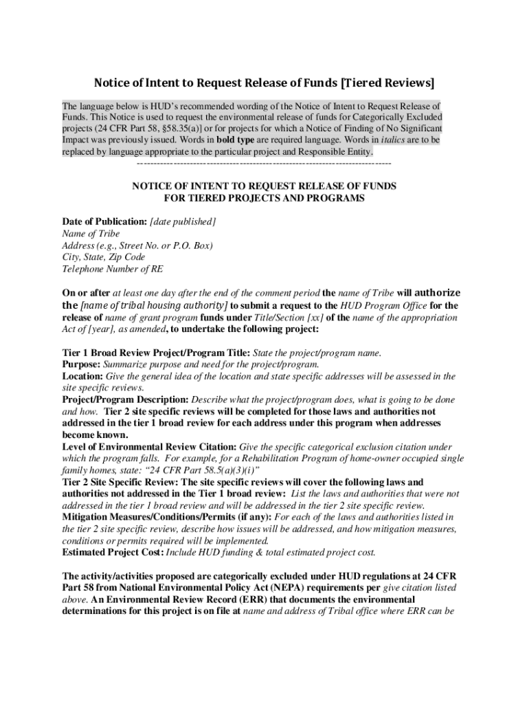 Notice of Intent to Request Release of Funds [Tiered Reviews] The language below is HUD's recommended wording of the Notice of Intent to Request Release of Funds. This Notice is used to request the