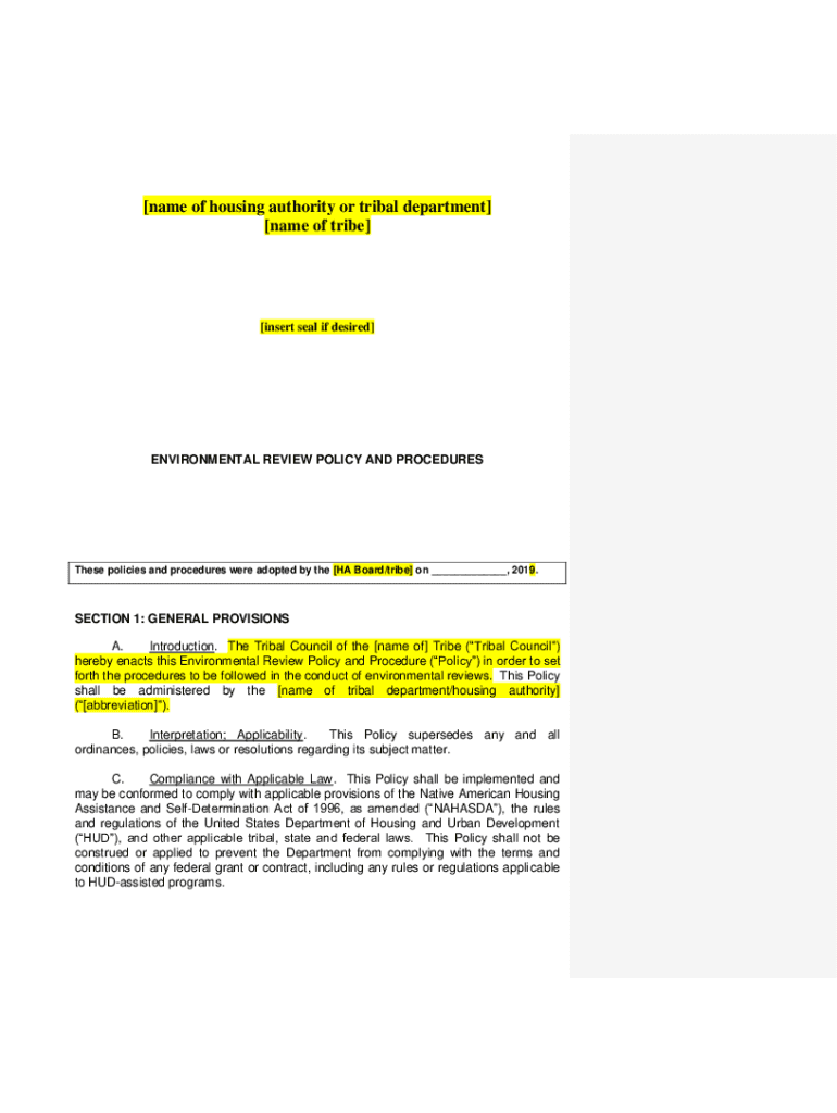 [name of housing authority or tribal department] [name of tribe][insert seal if desired]ENVIRONMENTAL REVIEW POLICY AND PROCEDURESThese policies and procedures were adopted by the [HA Board/tribe]