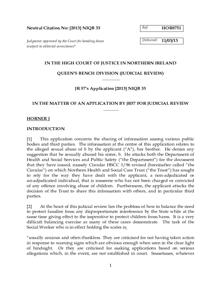 Neutral Citation No: [2013] NIB 33Ref:HOR8751Judgment: approved by the Court for handing undelivered:11/03/13(subject to editorial corrections)*IN THE HIGH COURT OF JUSTICE IN NORTHERN IRELAND