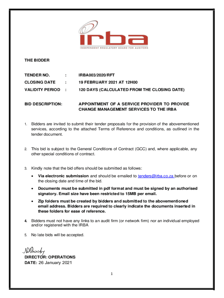 THE BITDEFENDER NO.:IRBA003/2020/CLOSING DATE:19 FEBRUARY 2021 AT 12H00VALIDITY PERIOD:120 DAYS (CALCULATED FROM THE CLOSING DATE)BID DESCRIPTION:APPOINTMENT OF A SERVICE PROVIDER TO PROVIDE CHANGE