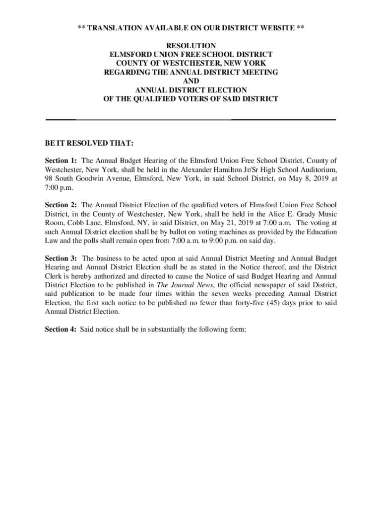 ** TRANSLATION AVAILABLE ON OUR DISTRICT WEBSITE ** RESOLUTION CHELMSFORD UNION FREE SCHOOL DISTRICT COUNTY OF WESTCHESTER, NEW YORK REGARDING THE ANNUAL DISTRICT MEETING AND ANNUAL DISTRICT ELECTION