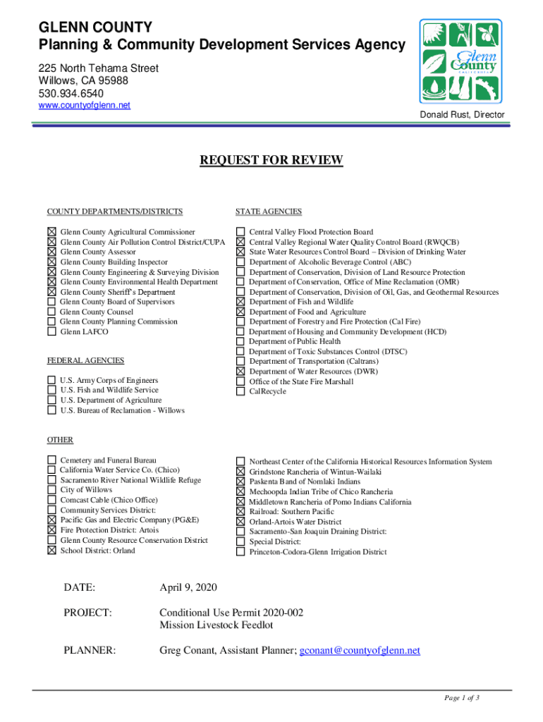 GLENN COUNTY Planning & Community Development Services Agency 225 North Team Street Willows, CA 95988 530.934.6540 www.countyofglenn.net Donald Rust, DirectorREQUEST FOR REVIEWCOUNTY DEPARTMENTS/DISTRICTS
