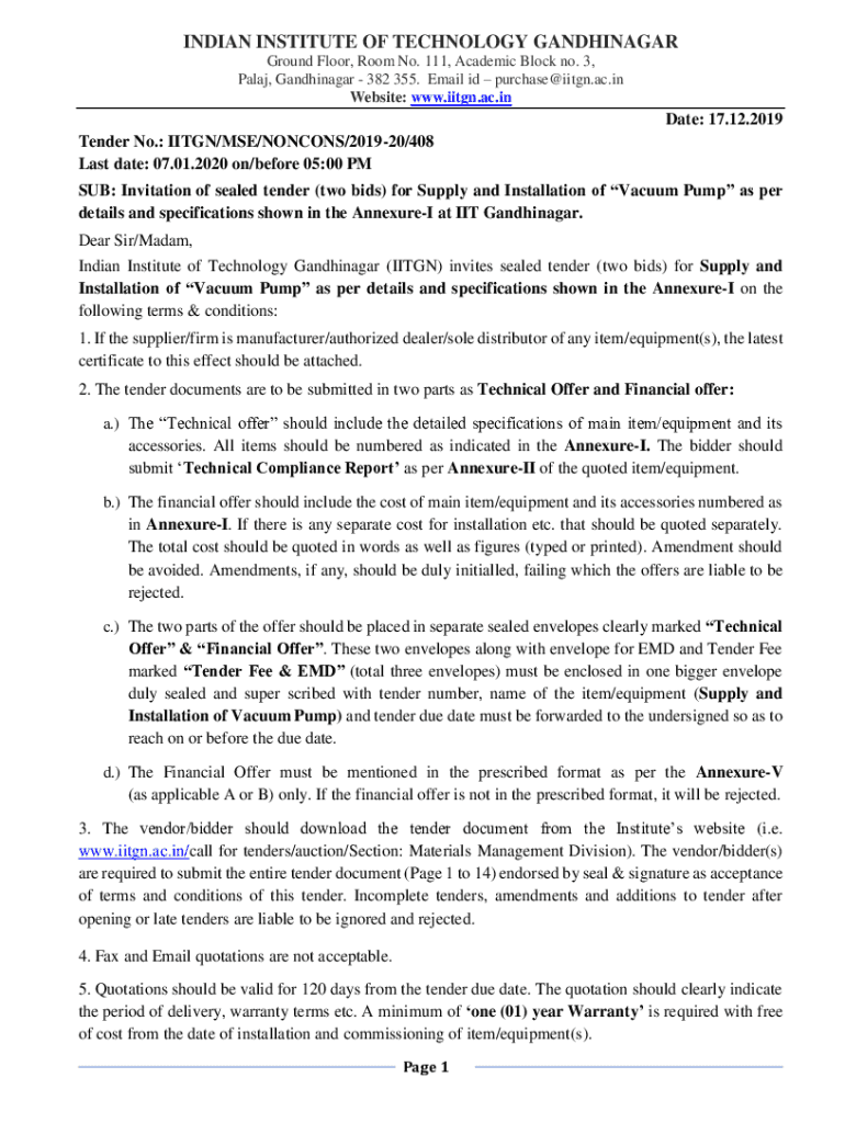 INDIAN INSTITUTE OF TECHNOLOGY GANDHINAGAR First Floor, Room No. 111, Academic Block no. 3, Paley, Gandhinagar 382 355. Email id purchase@iitgn.ac.in Website: www.iitgn.ac.inDate: 17.12.2019 Tender